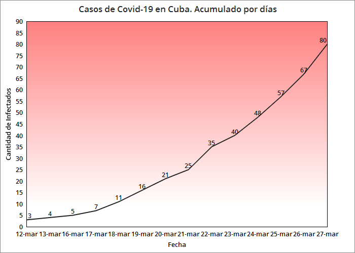 - Ciudadana cubana de 21 años de edad, residente en el municipio Cerro, provincia La Habana. Arribó el 4 de marzo procedente de España. Es contacto de su esposo, caso confirmado el 20 de marzo. Como parte del control de foco de su esposo, el día 21 fue detectada con síntomas y aislada en el Hospital “Luis Díaz Soto”. Se mantienen en vigilancia 12 contactos.