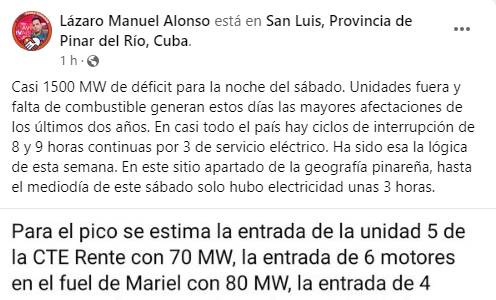 “En casi todo el país hay ciclos de interrupción de 8 y 9 horas continuas por 3 de servicio eléctrico. Ha sido esa la lógica de esta semana”, refiere Alonso, quien está de visita en su pueblo natal de Pinar del Río. “En este sitio apartado de la geografía pinareña, hasta el mediodía de este sábado solo hubo electricidad unas tres horas”, añadió el comunicador oficialista en referencia al municipio de San Luis.