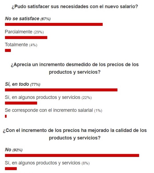 Algunas de las preguntas de la encuesta eran: “¿Pudo satisfacer sus necesidades con el nuevo salario?”, “¿Logra adquirir con el nuevo salario, jubilación o pensión los productos y servicios de primera necesidad?” y ¿Aprecia un incremento desmedido de los precios?”.