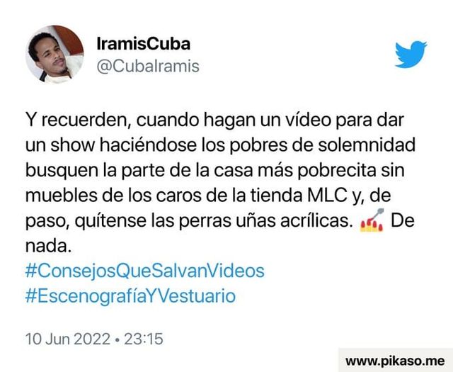 Por su parte, Iramís Rosique, Licenciado en Bioquímica y quien constantemente es referenciado en los medios estatales de prensa como “intelectual”, escribió en su perfil de Twitter: “Y recuerden, cuando hagan un video para dar un show haciéndose los pobres de solemnidad, busquen la parte de la casa más pobrecita sin muebles caros de la tienda MLC y de paso, quítense las perras uñas acrílicas”.