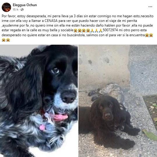 “Por favor, estoy desesperada, mi perra lleva ya tres días sin estar conmigo, no me hagan esto. Necesito irme con ella, voy a llamar a CENASA para ver qué puedo hacer con el viaje de mi perrita”, publicó la afectada, refiriéndose al Centro Nacional de Sanidad Animal, entidad encargada de regular el transporte de animales en Cuba.