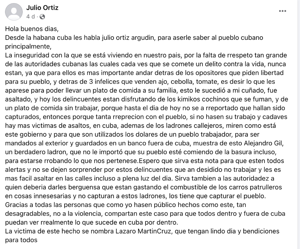 En un mensaje en Facebook, Ortiz expresó su indignación por la falta de seguridad y el descuido de las autoridades cubanas ante la ola de delincuencia que afecta a la población: “la inseguridad con la que se está viviendo en nuestro país, por la falta de respeto tan grande de las autoridades cubanas, las cuales cada vez que se comete un delito contra la vida, nunca están, ya que para ellos es más importante andar detrás de los opositores que piden libertad para su pueblo, y detrás de 3 infelices que venden ajo, cebolla, tomate, es decir lo que les aparece para poder llevar un plato de comida a su familia”.