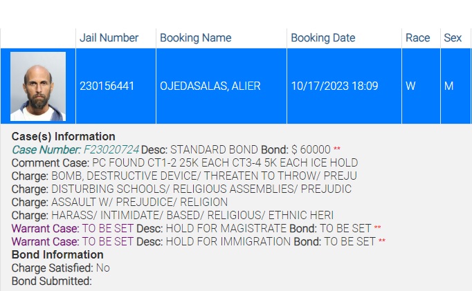 Ojeda Salas, quien es un indigente, fue detenido en cuestión de minutos y trasladado a un interrogatorio. Al ser presentado ante la jueza Mindy S. Glazer, se le notificó que enfrenta cargos por los delitos de perturbar una escuela o asamblea religiosa, amenazar con colocar un dispositivo destructivo, agredir con prejuicios y acosar o intimidar por motivos religiosos.