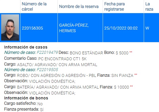 Los registros del condado de Miami-Dade indican que García enfrenta cargos por asalto agravado con arma mortal. Anteriormente, había sido acusado por supuestos hechos de violencia doméstica y robo con agresión.