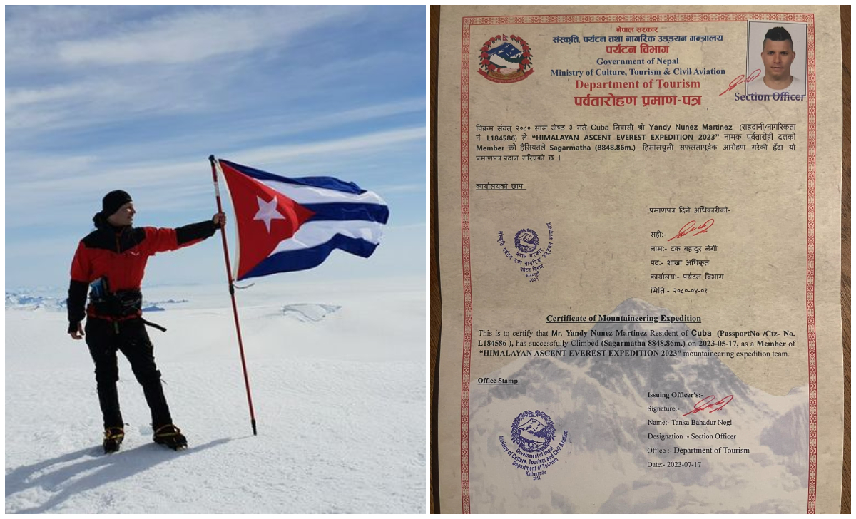 Yandy Núñez Martínez, primer cubano en alcanzar la cima del Everest, recibió el certificado oficial que acredita su hazaña, realizada el pasado 17 de mayo. El alpinista compartió en Facebook una fotografía del documento y aseguró que pronto publicará unos videos suyos en la cumbre de esta montaña.