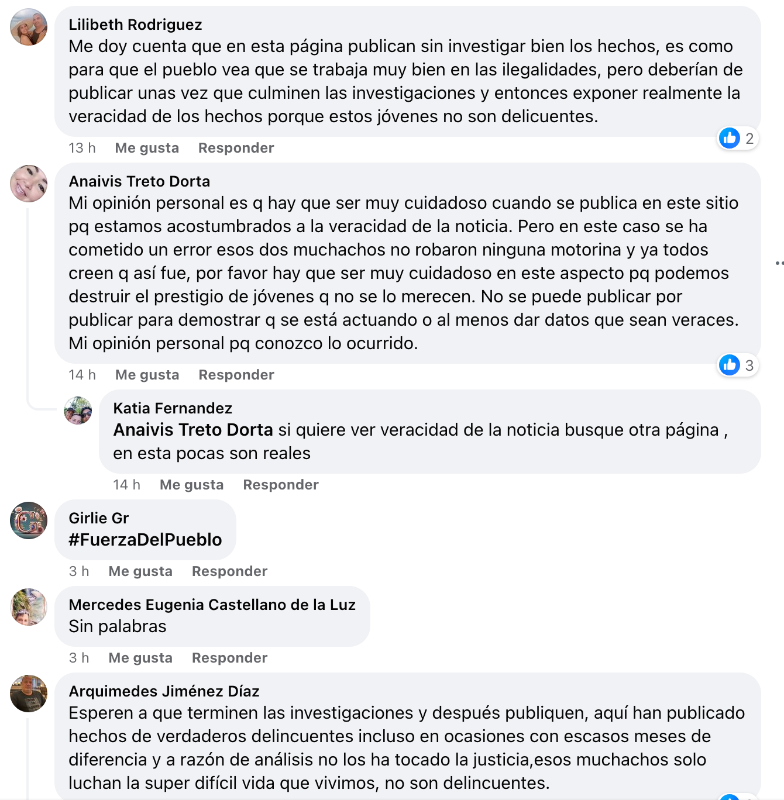 Varios usuarios comentaron en el post, afirmando que los jóvenes no son bandidos: “Me doy cuenta de que en esta página publican sin investigar adecuadamente los hechos. Es como si quisieran mostrar al pueblo que están trabajando muy bien en las ilegalidades, pero deberían publicar una vez que las investigaciones estén completas y luego exponer la verdad de los hechos porque estos jóvenes no son criminales”, escribió una persona nombrada en Facebook como Lilibeth Rodríguez.