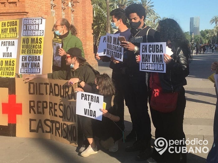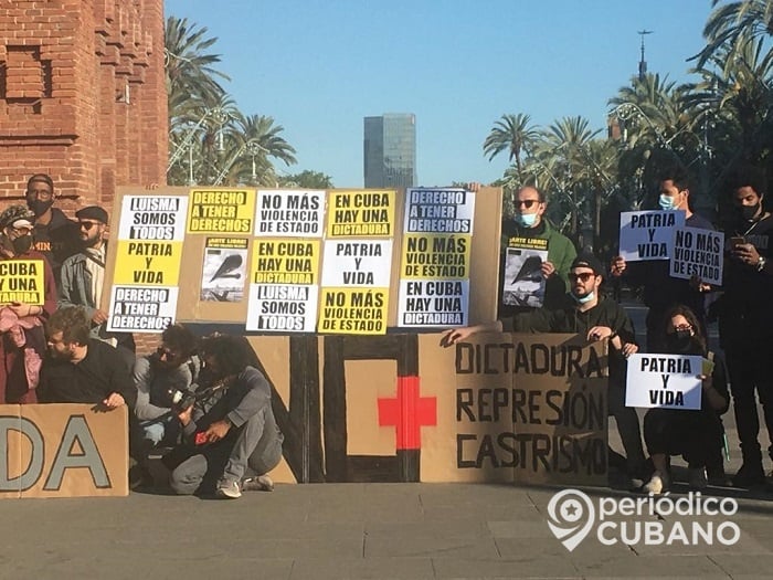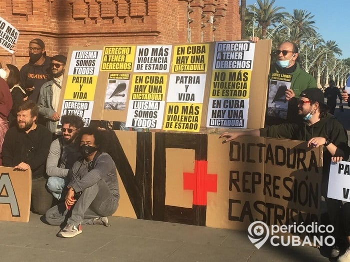 Los cubanos de Barcelona se plantaron en el Arco del Triunfo con carteles que decían “Fe de vida”, “No más dictadura, represión y Castros”, “LuisMa somos todos”, “No más violencia de Estado” y “Patria y Vida”.