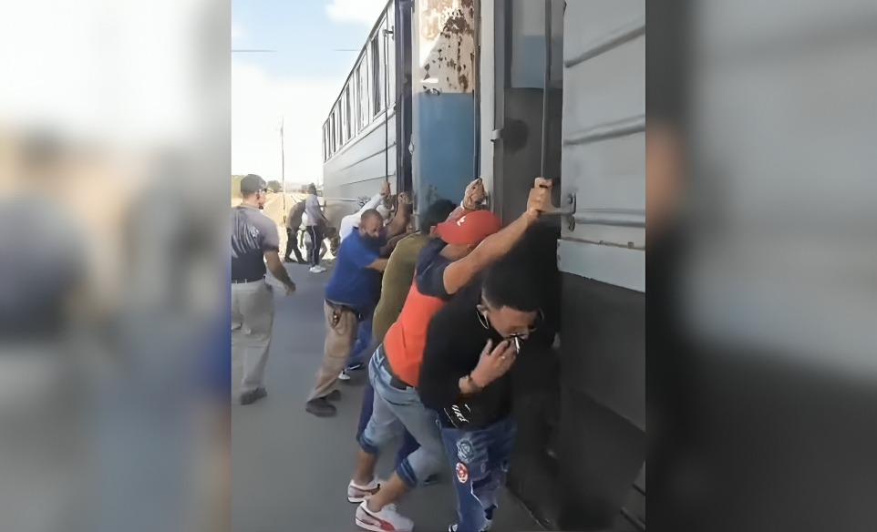 Las imágenes, compartidas por el periodista Mario J. Pentón, muestran a un grupo de pasajeros alrededor de los vagones ofreciendo todos sus esfuerzos para movilizar el tren ante la falta de mantenimiento adecuado por parte del gobierno.