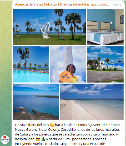 “Un viaje fuera del país hacia la Isla de Pinos o Juventud. Conozca Nueva Gerona, hotel Colony, Cocodrilo, unos de los faros más altos de Cuba y a los pineros que se caracterizan por su calor humano y hospitalidad. A partir de 18 mil por persona, tres noches, incluyendo vuelos, traslados, alojamiento y una excursión”, refiere la nota oficial divulgada en el grupo de Telegram que tiene Cubatur para vender paquetes turísticos.