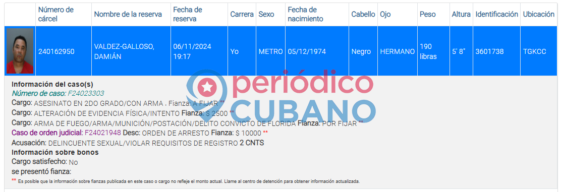 Damián Valdez Galloso, el principal sospechoso en el asesinato del reguetonero cubano José Manuel Carvajal, conocido como El Taiger, fue extraditado desde Nueva York a Miami, según confirmó Periódico Cubano a través del sitio oficial de la ciudad de Miami-Dade.