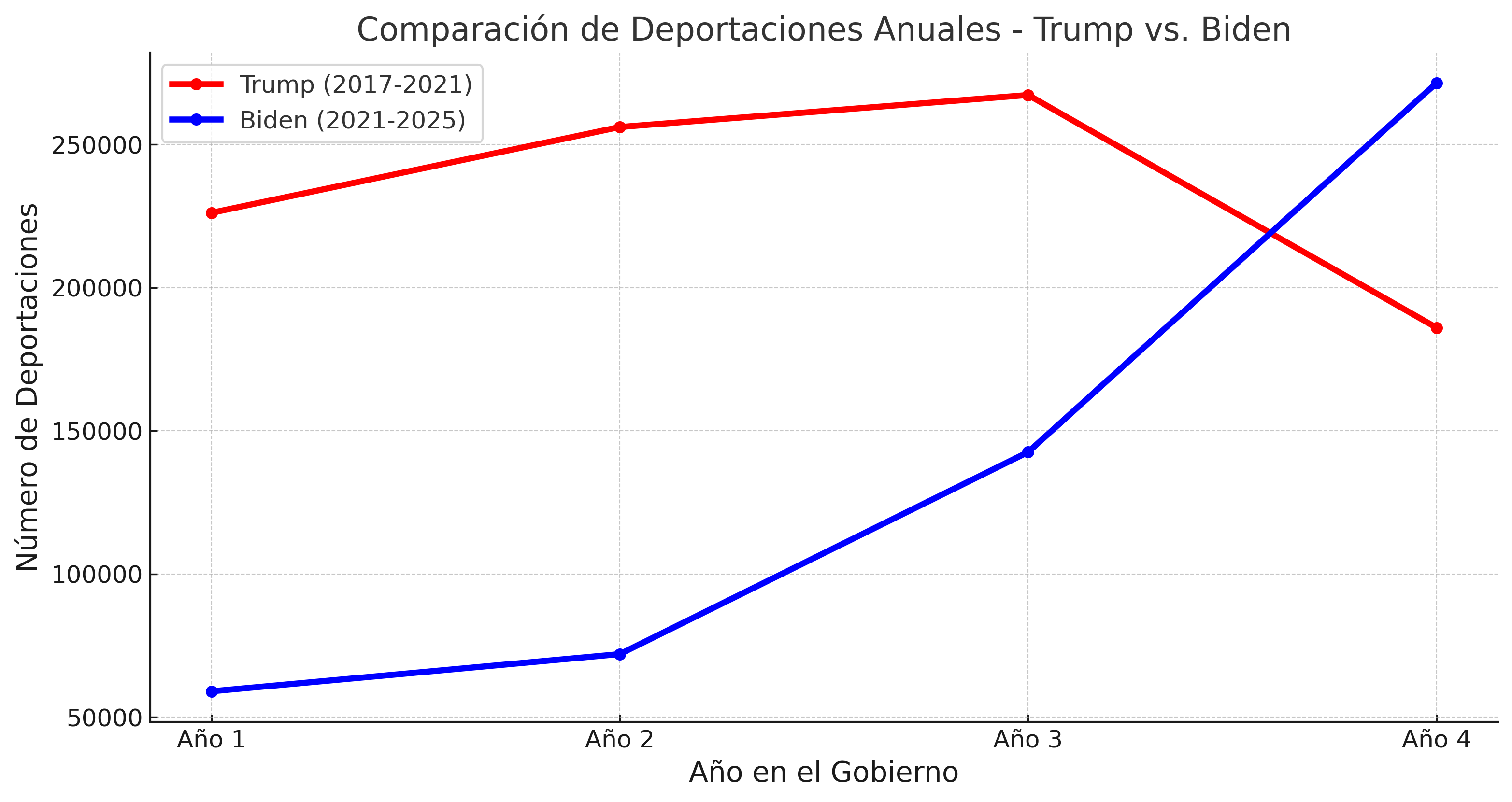 Biden, en cambio, comenzó con cifras bajas en 2021 y 2022, reflejando una postura más moderada. Sin embargo, en 2024 presionado por las elecciones, aumentó las deportaciones drásticamente, alcanzando el nivel más alto en una década.