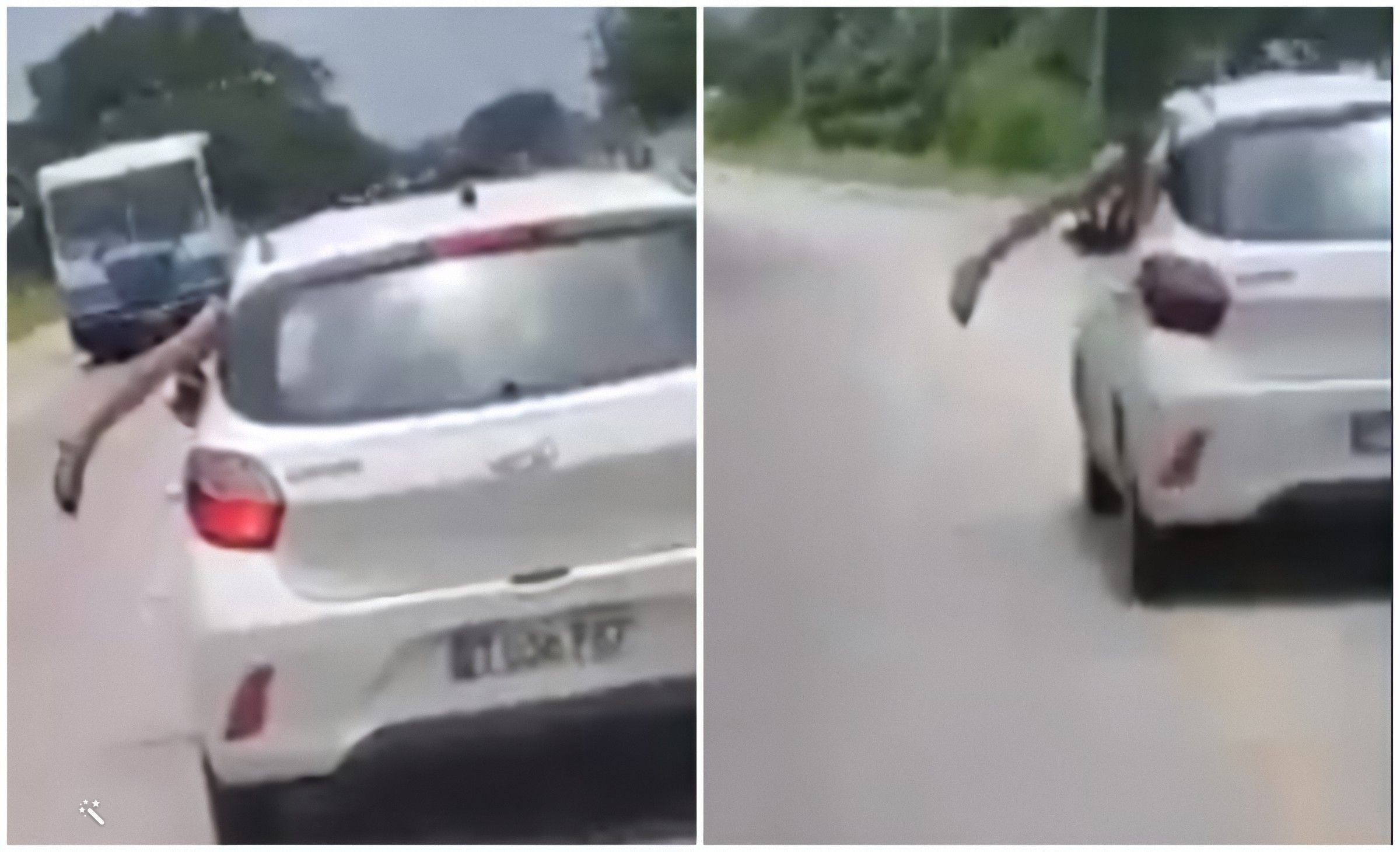 En las imágenes al estilo hollywoodense se ven los pies del cubano batiendo en el aire mientras lucha con sus manos y el torso del cuerpo para estar aferrado al parabrisas.