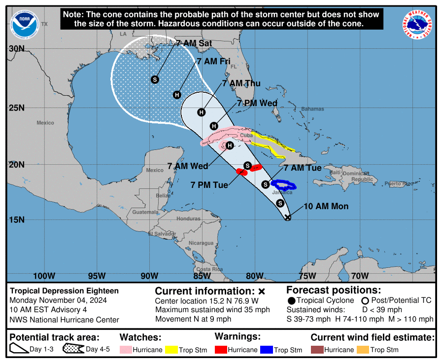 A las 10:00 a.m. del lunes, el centro de la Depresión Tropical Dieciocho se encuentra cerca de la latitud 15.2° Norte y longitud 76.9° Oeste, aproximadamente a 310 km al sur de Kingston, Jamaica, y a 645 km al sureste de Gran Caimán. Se desplaza hacia el norte a 15 km/h con vientos sostenidos de 55 km/h y una presión central mínima de 1003 mb.
