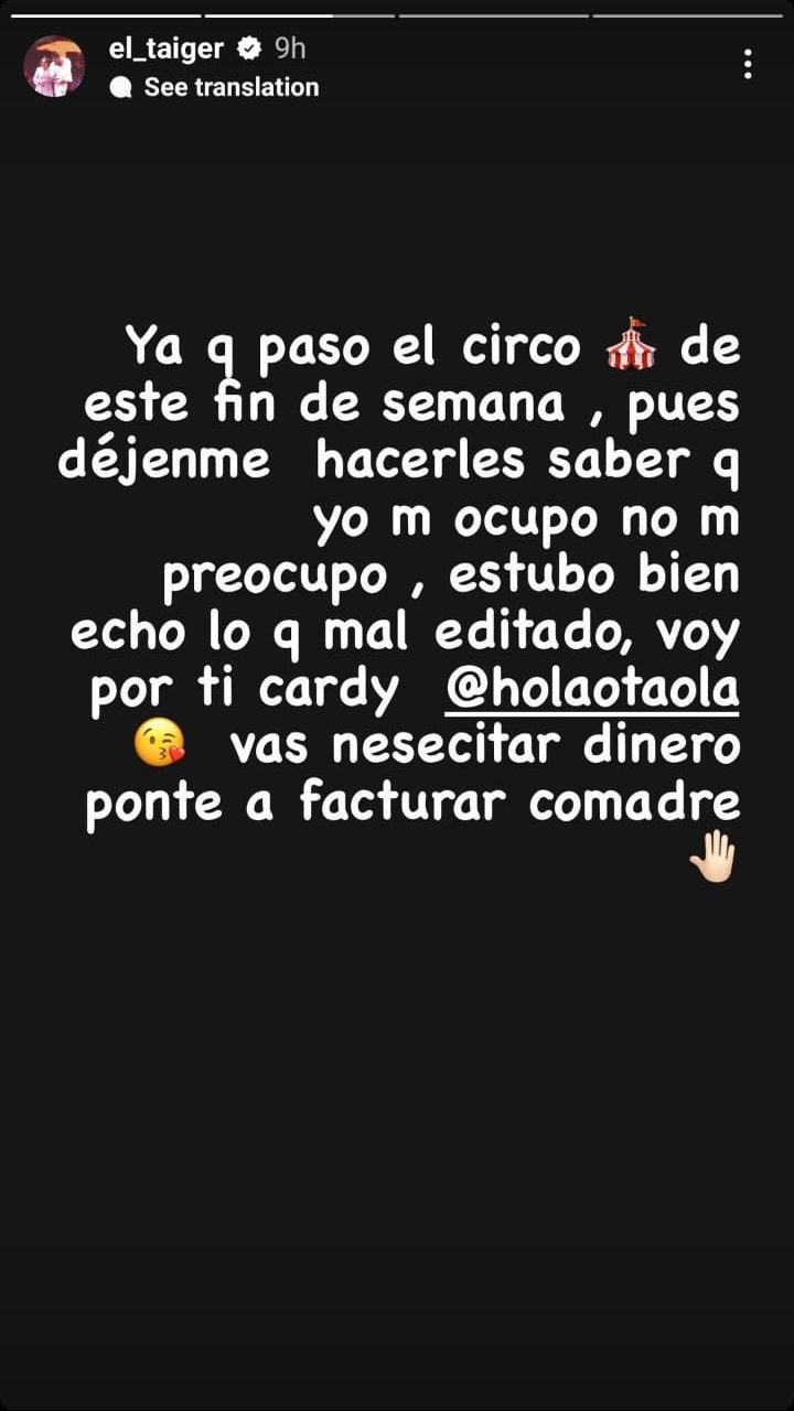 A través de una historia de Instagram, José Manuel escribió: “Ya que pasó el circo de este fin de semana, pues déjenme hacerles saber que yo me ocupo, no me preocupo, estuvo bien hecho, lo que mal editado, voy por ti cardy @holaotaola, vas a necesitar dinero, ponte a facturar comadre”.