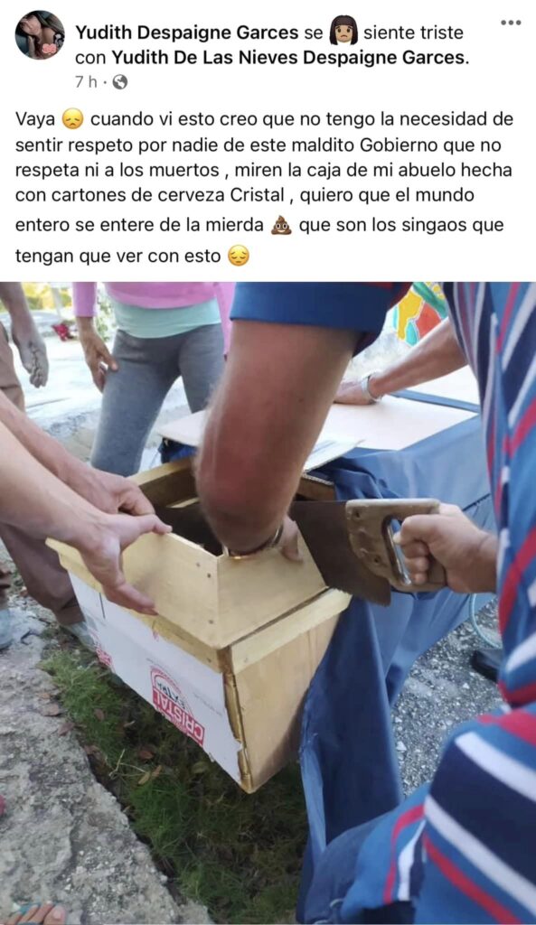 Entre los comentarios de solidaridad a esta lamentable situación, una usuaria le revela a Despaigne que la entiende y que le parece muy triste que en el país no haya ni en qué sacar a los cadáveres de la funeraria. “Hay que pagarle para que tu familiar sea uno de los primeros y hay que pagar en el crematorio porque si no pagas tienes que estar muchas horas. Esto da vergüenza”, confirma la internauta.