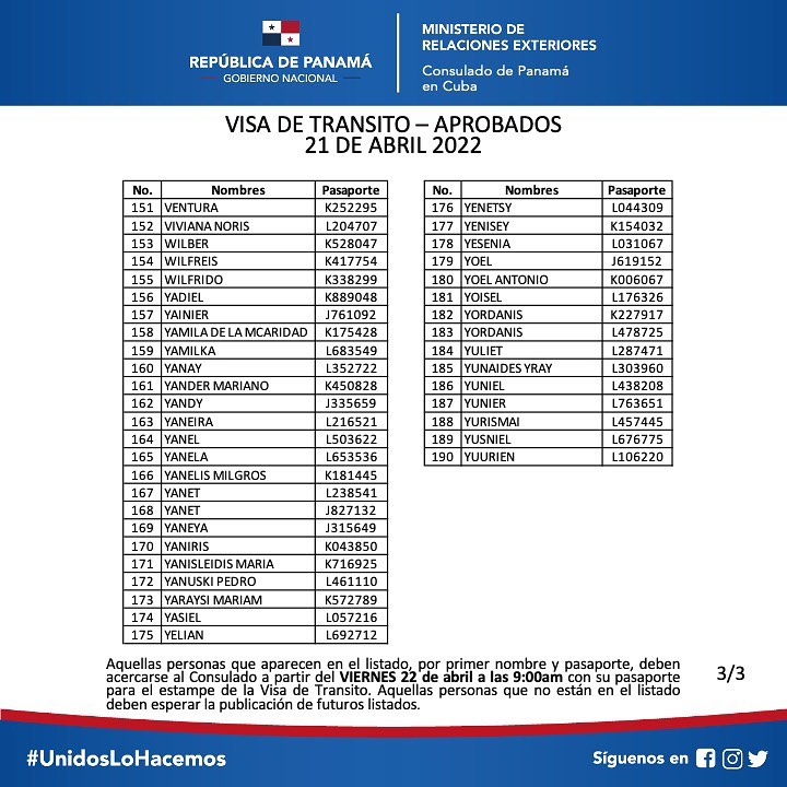 Listado de visas de tránsito a Panamá (20 y 21 de abril)