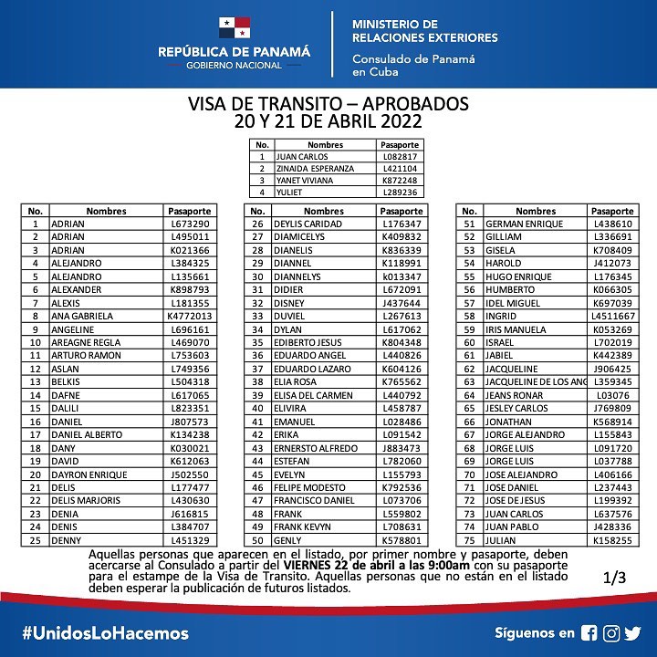 El pasado viernes la representación diplomática panameña en Cuba, publicó un listado de resoluciones positivas a la visa de tránsito, pero según testimonios de algunos de los beneficiados con los documentos, habían solicitado el visado hace más de un mes.
