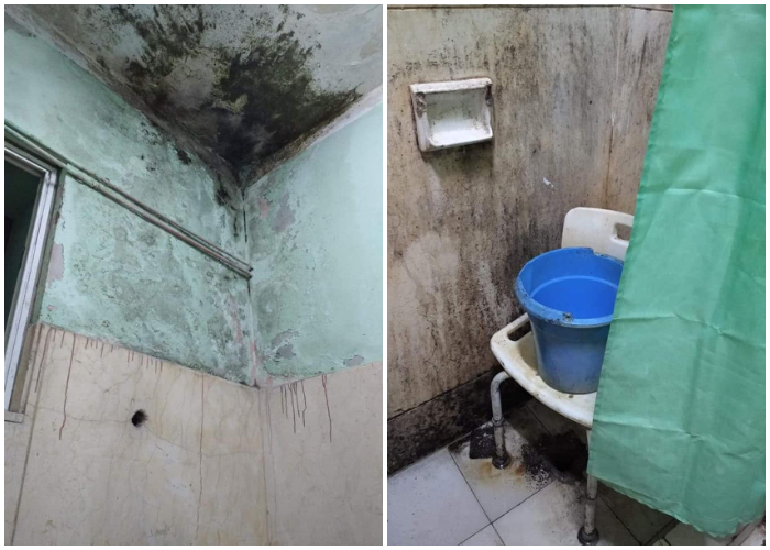 Las fotografías detallan el deterioro de las paredes, techo y mobiliario del lugar, con manchas de humedad llenas de hongos, el retrete sucio, las cortinas gastadas y el piso también en mal estado.
