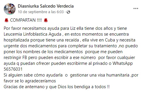 Liz, una niña cubana de dos años, enfrenta serias complicaciones de salud por ser paciente de una leucemia linfoblástica aguda. Recientemente, experimentó una recaída y en estos momentos se encuentra hospitalizada con la urgencia de requerir medicamentos que están desabastecidos en la Isla.