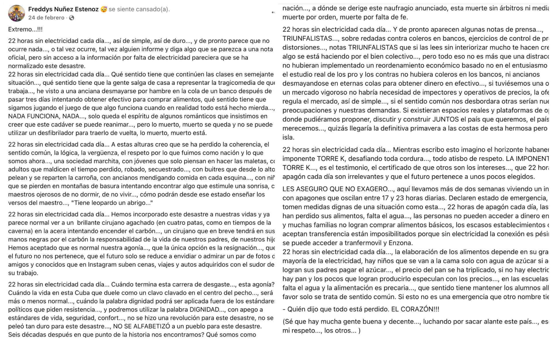 En el mes de febrero, el artista publicó en Facebook un escrito que era un grito desesperado ante la crítica situación que enfrenta la Isla, marcada por apagones de hasta 22 horas diarias.
