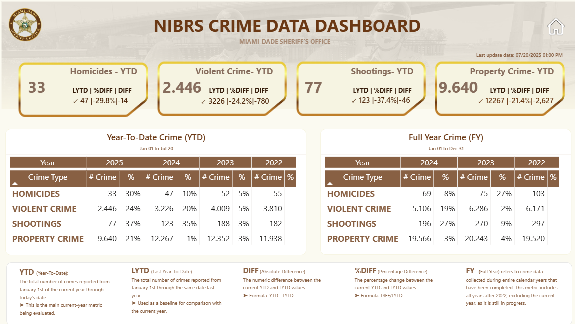 Hasta el 20 de julio de 2025, Miami-Dade registró 33 homicidios, lo que representa una disminución del 30% respecto a los 47 homicidios reportados en el mismo período de 2024.