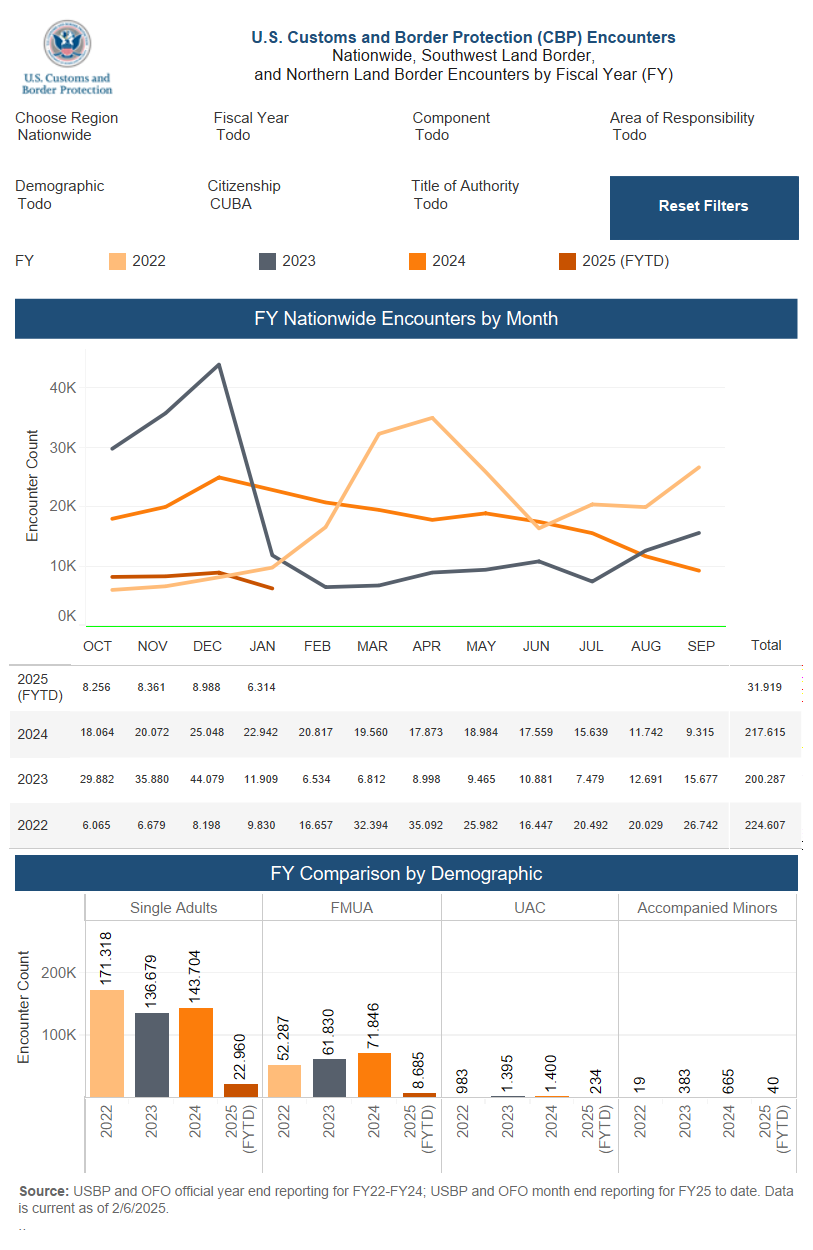 Los datos de CBP muestran una caída constante en los cruces de cubanos desde el año fiscal 2024 al 2025. En el año fiscal 2024, un total de 217.615 cubanos lograron ingresar a EEUU, mientras que en lo que va del año fiscal 2025 (cinco meses), la cifra se ha reducido drásticamente a 31.919. En enero de 2024, 22.942 cubanos cruzaron la frontera, mientras que en enero de 2025, solo 6.314 lo lograron, una caída de más del 70%.