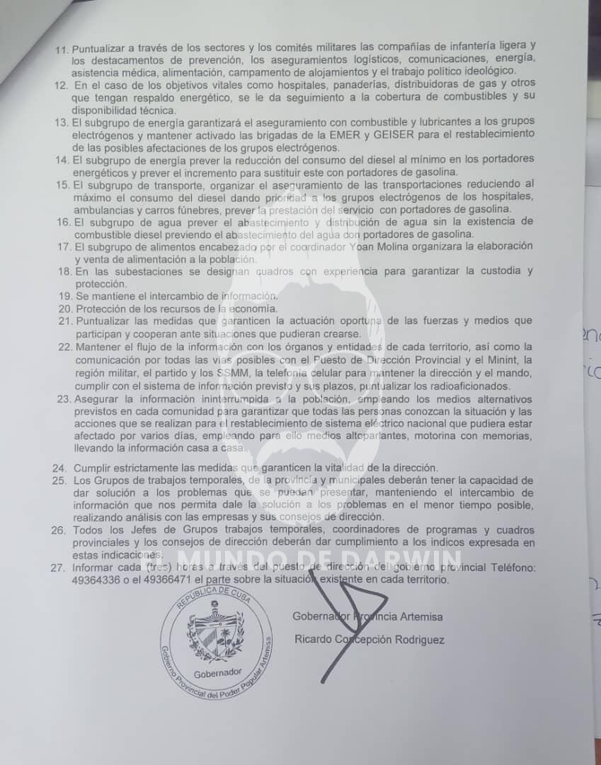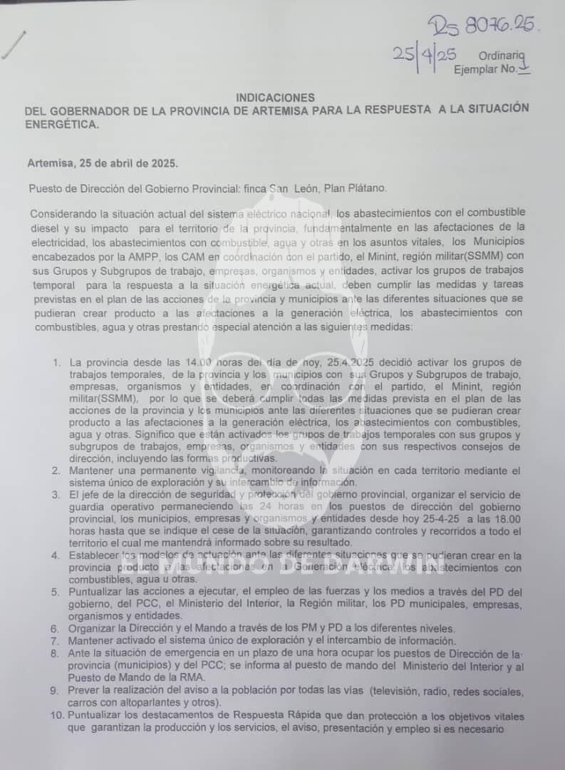 Por ejemplo, la orden refiere que todos los días los grupos y subgrupos de trabajo de Artemisa, en coordinación con el Partido, el Ministerio del Interior y la región militar, realicen una evaluación de la situación. En ese sentido, se ordena implementar acciones estratégicas para asegurar el suministro de energía, agua y combustibles a instituciones vitales.