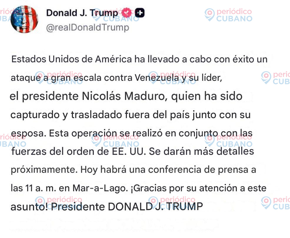 “Estados Unidos ha llevado a cabo con éxito un ataque a gran escala contra Venezuela y su líder, el presidente Nicolás Maduro, quien fue capturado y trasladado en avión, junto con su esposa, fuera del país”, escribió Trump en su cuenta de Truth Social.