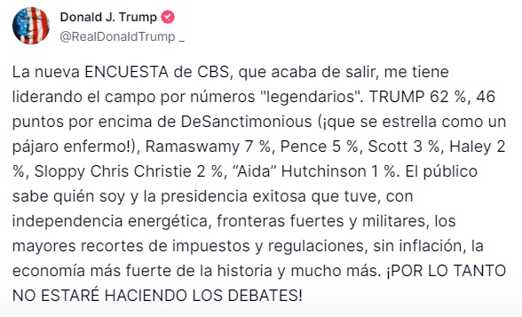 “El público sabe quién soy y la presidencia exitosa que tuve, con independencia energética, fronteras fuertes y militares, los mayores recortes de impuestos y regulaciones, sin inflación, la economía más fuerte de la historia y mucho más. ¡Por lo tanto, no estaré haciendo los debates!”, escribió el magnate en su red social.