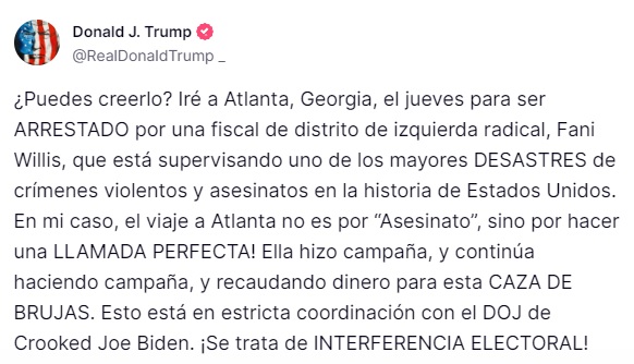 “¿Puedes creerlo? Iré a Atlanta, Georgia, el jueves para ser arrestado por una fiscal de distrito de izquierda radical, Fani Willis”, escribió el magnate en su plataforma Truth Social.