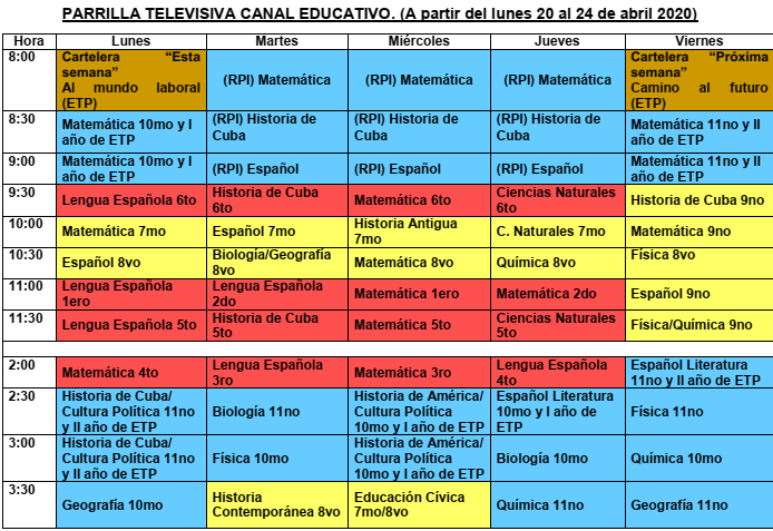 Según Ena Elsa Velázquez Cobiella, titular del Mined, los nuevos programas emitidos por el Canal Educativo emitirá cuatro espacios para el 9no grado los viernes a partir de las 9:30 a.m. Estos serán dedicados a Historia, Matemática, Español, Física y Química, estas dos últimas en semanas alternas.