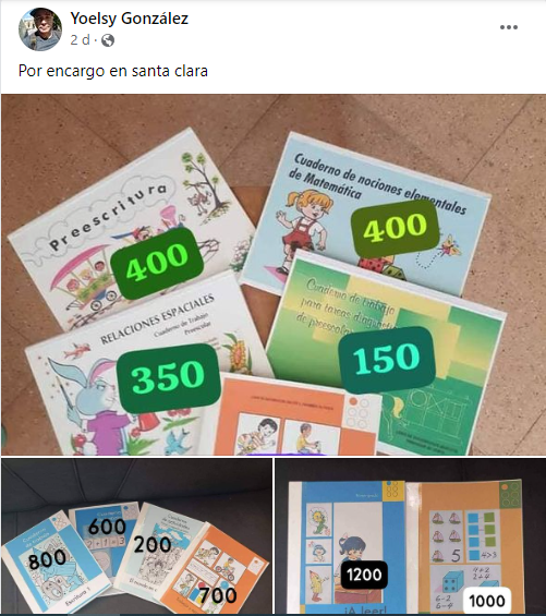 En las redes sociales proliferan los anuncios de venta de textos, sobre todo aquellos relacionados con la enseñanza primaria. Por ejemplo, un ejemplar para adquirir los primeros conocimientos de la lengua española en el primer grado tiene un costo de 1.200 pesos cubanos (CUP). En el caso del cuaderno de matemáticas, está valorado en 1.000 CUP.