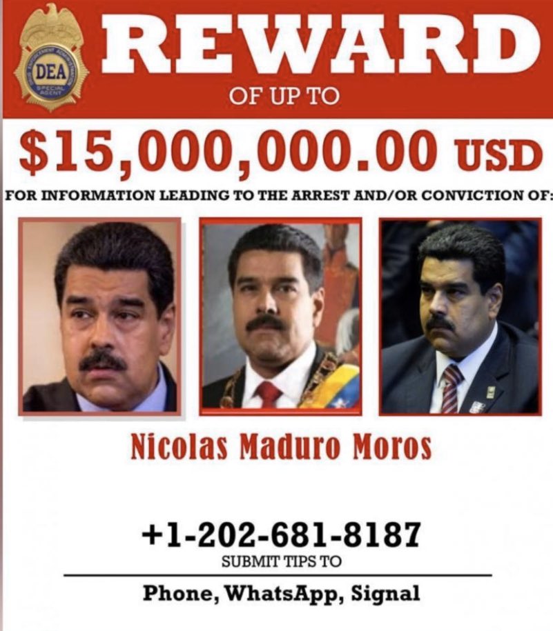 El gobierno de Estados Unidos acusó al mandatario venezolano Nicolás Maduro de tráfico internacional de drogas y terrorismo, y ofrece una recompensa de 15 millones de dólares por su captura.