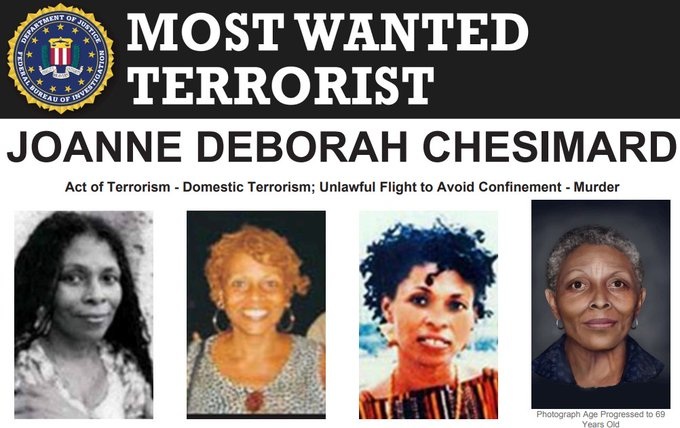 The #FBI offers a reward of up to $1,000,000 for info directly leading to the apprehension of Joanne Chesimard, wanted for escaping from prison in Clinton, NJ, while serving a life sentence for the May 2, 1973, murder of a New Jersey State Police trooper: https://t.co/d22Ij0XTFT pic.twitter.com/wKZTasJV43