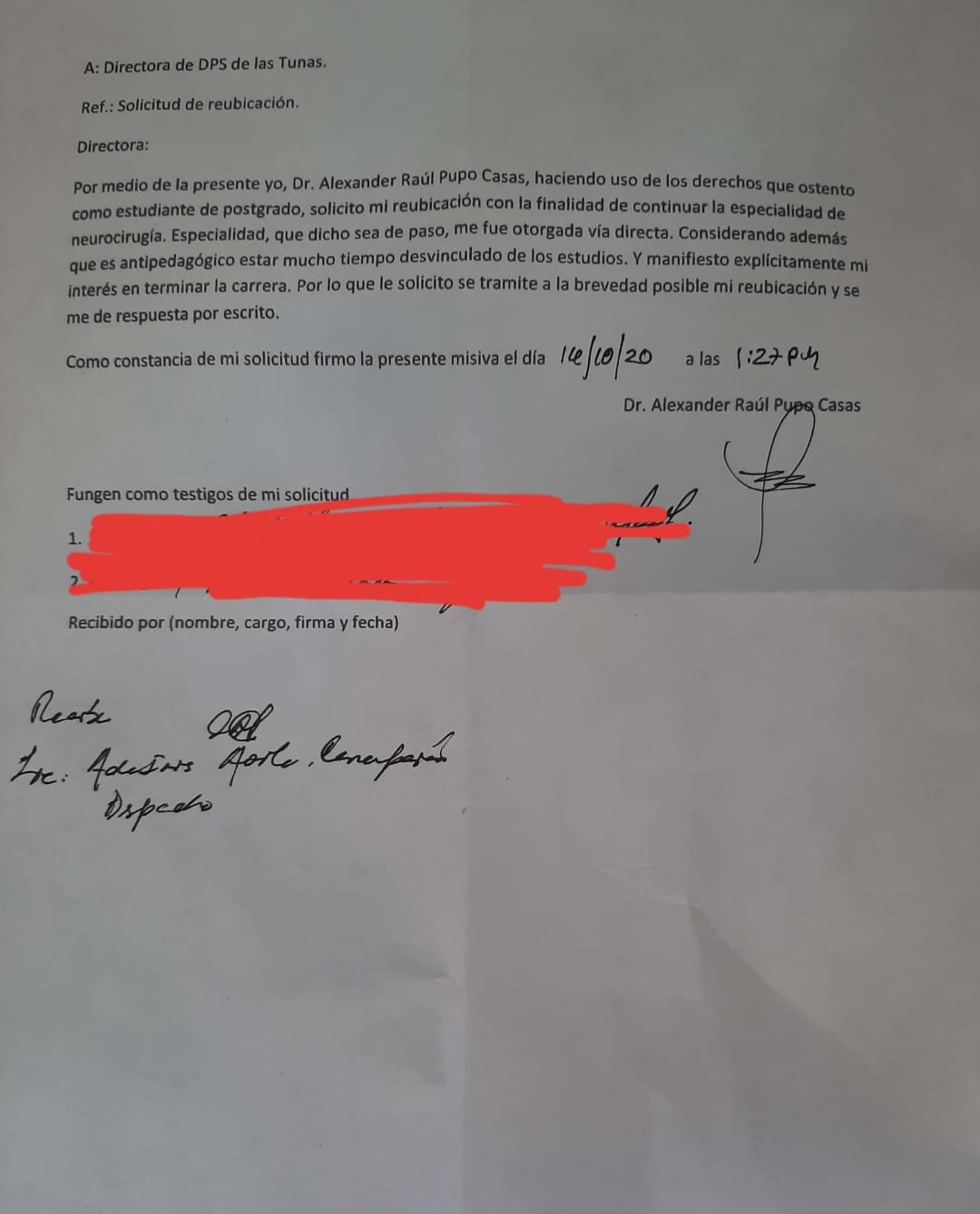 Hola a todos. Hace unos días, basándome en los derechos que ostento como estudiante de posgrado, entregué una solicitud de reubicación en la Dirección Provincial de Salud de Las Tunas. Al considerar que no he cometido ni delito, ni indisciplina laboral alguna, presenté una solicitud formal para que me dieran la posibilidad de continuar mi especialidad en paz.
