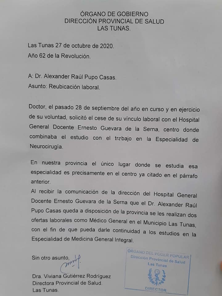 El doctor Alexander Raúl Pupo Casas, quien fue expulsado de una beca en Las Tunas donde cursaba la especialidad de Neurocirugía, solicitó que las autoridades sanitarias le permitieran continuar sus estudios.