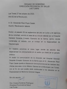 Haciendo uso de sus derechos como estudiante de posgrado, el galeno hizo llegar una petición de reubicación a la Dirección de Salud de la oriental provincia, alegando que no había cometido ningún delito o indisciplina laboral.