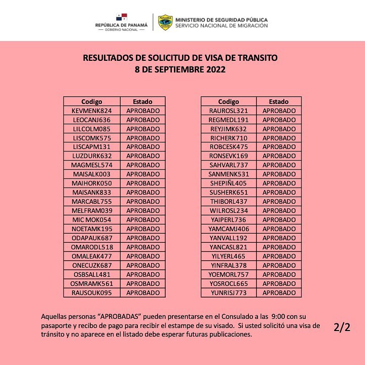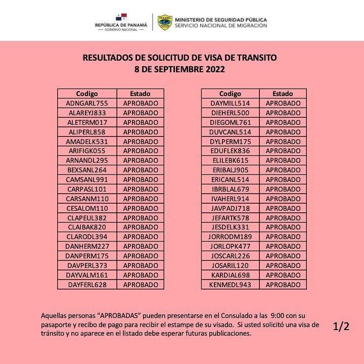 Tanto para las visas de tránsito como las de turismo, el aviso oficial de la Embajada de Panamá indica que todos aquellos cubanos que se reconozcan en los listados como aprobados “pueden presentarse en el Consulado a las 9:00 a.m. con su pasaporte y recibo de pago para recibir el estampe de su visado”.