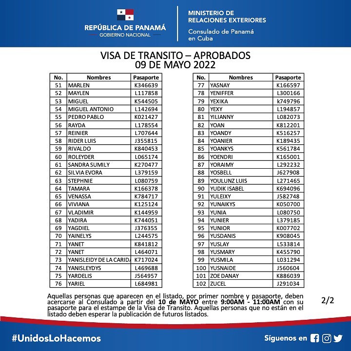 Lista de cubanos con visa de tránsito a Panamá el 9 de mayo