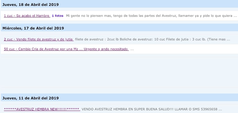 Tal es el caso de un usuario que ha publicado un anuncio donde ofrece carne de avestruz, cocodrilo y jutía; explicando además los diversos usos que puede tener cada animal.