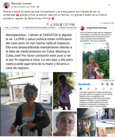 El emotivo reencuentro de Mariela con su familia fue anunciado en el grupo de Facebook C & V Revolico-Holguín por la usuaria Maricelys Juanqui, quien expresó su gratitud: “Gracias a todas las personas que compartieron y se preocuparon por Mariela, por su solidaridad, gracias a Dios ya está en casa con su familia”.