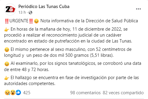 La nota del Minsap indica que el cadáver “pertenece al sexo masculino, con 52 centímetros de longitud y un peso de dos mil 500 gramos (5,51 libras)”.