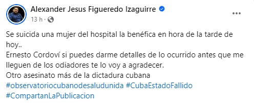 “La muchacha tenía problemas de esquizofrenia y estaba enferma de los nervios, era mi prima, tremenda enfermera, mujer, amiga y madre”, expresó con tristeza en los comentarios del post de Figueredo Izaguirre.