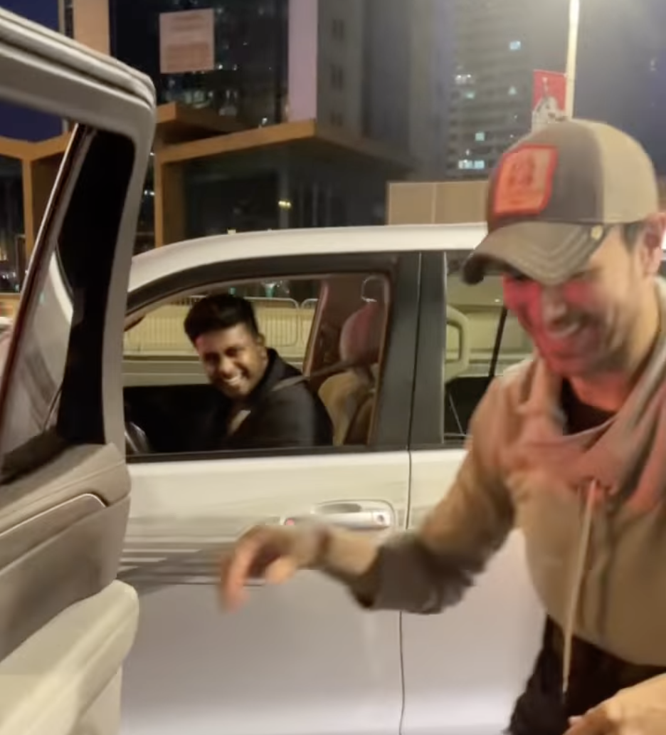 Mientras el carro del artista estaba detenido en lo que parece ser un semáforo, una persona desde otro auto le pregunta si puede hacerse una fotografía con él.
