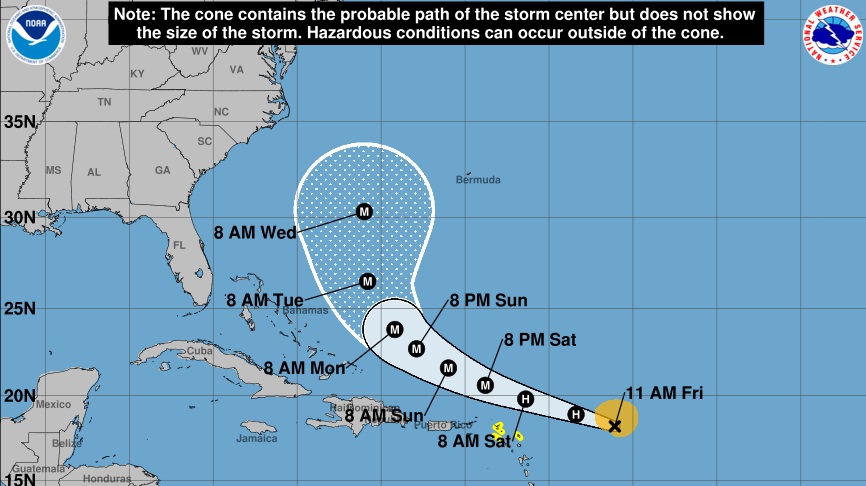 Se espera que el huracán pase cerca o al norte de las islas Leeward este sábado, lo que mantiene en alerta a varios territorios del Caribe. El NHC ha emitido avisos de tormenta Anguila, Barbuda, San Martín, San Bartolomé, Saba, San Eustaquio y San Martín.