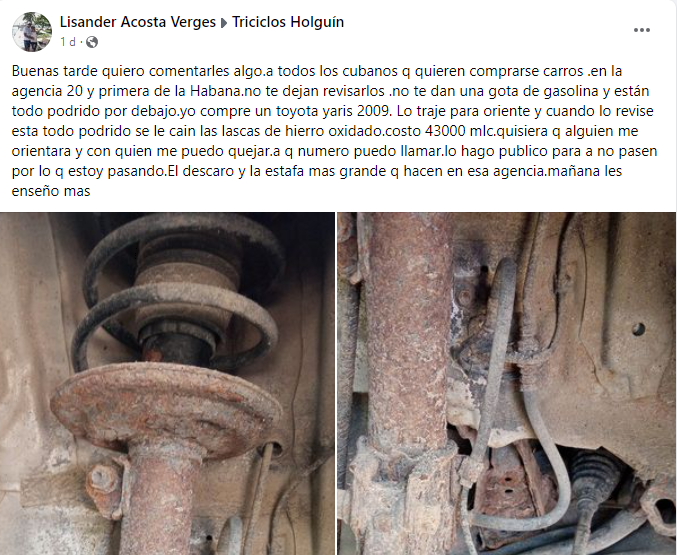 “Yo compré un Toyota Yaris 2009. Lo traje para oriente y cuando lo revise está todo podrido se le caen las lascas de hierro oxidado. Costó 43.000 MLC”, indica el cubano en su perfil de Facebook, que pide orientación para poder quejarse.