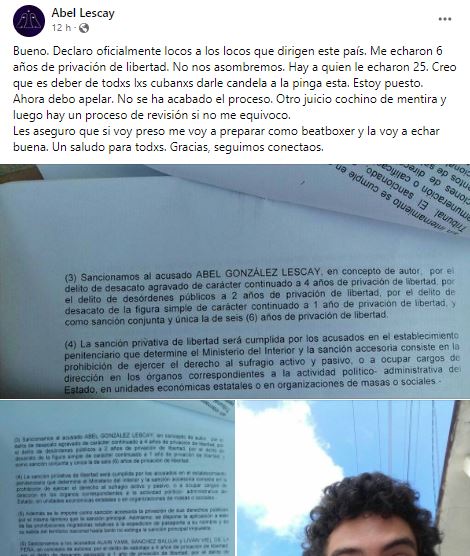 “Declaro oficialmente loco a los locos que dirigen este país. Me echaron seis años de privación de libertad. No nos asombremos. Hay a quien le echaron 25. Creo que es deber de todos los cubanos darle candela a la pin.. esta. Estoy puesto. Ahora debo apelar. No se ha acabado el proceso. Otro juicio cochino de mentira y luego hay un proceso de revisión, si no me equivoco. Les aseguro que si voy preso me voy a preparar como beatboxer y la voy a echar buena”, escribió Lescay.