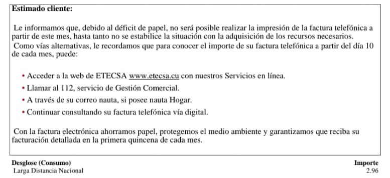 De tal forma, Etecsa se asegura de aprovechar la actual coyuntura para dar de baja del servicio de facturación impresa a miles de clientes que, al no tener un reporte del consumo detallado, optarán para siempre por la versión digital.