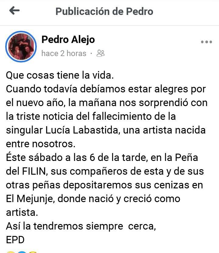 “Qué cosas tiene la vida. Cuando todavía debíamos estar alegres por el nuevo año, la mañana nos sorprendió con la triste noticia del fallecimiento de la singular Lucía Labastida, una artista nacida entre nosotros. Este sábado a las 6 de la tarde, en la Peña del FILIN, sus compañeros de esta y de sus otras peñas depositaremos sus cenizas en El Mejunje, donde nació y creció como artista. Así la tendremos siempre cerca, EPD.”, expresó por su parte el cantante Pedro Alejo en su perfil de Facebook.