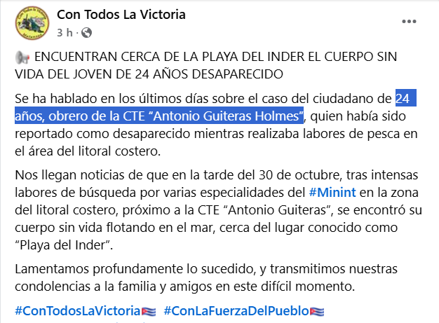 El cuerpo de un joven trabajador de la Central Termoeléctrica (CTE) Antonio Guiteras fue encontrado sin vida en la tarde del 30 de octubre en el litoral de la ciudad de Matanzas, cerca de la conocida playa del Inder. El cubano, de 24 años, había sido reportado como desaparecido tras realizar labores de pesca en el área.
